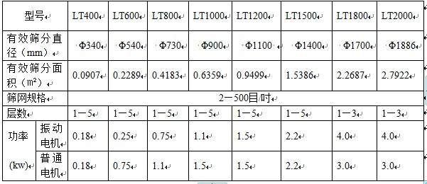 LT型振動篩主要技術(shù)參數(shù):